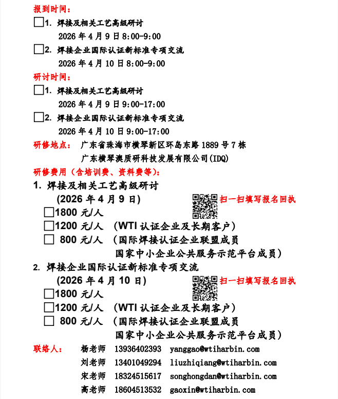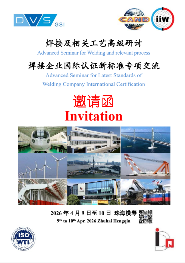 | 您当前位置:网站首页 >> 新闻动态 >> 培训动态 >> 邀请函-2026年4月9日至10日珠海横琴举办焊接及相关工艺高级研讨、焊接企业国际认证新标准专项交流 |